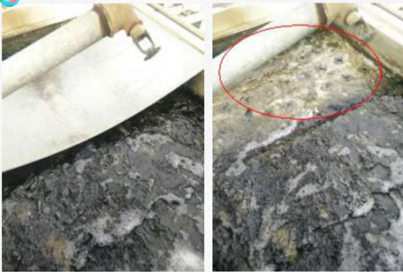 绿藻外观呈绿色。它有两种,一种是单细胞组成的,以小球藻浮于水中;另一种呈丝状,附于器壁之上。冷却塔布水器是适合绿藻生长的环境。这些绿藻会导致冷却塔部分水路运行不畅,引发堵塞,水藻死亡后分解产生的有毒物质,引起水质发黑发臭,危害人体健康等风险。如下图所示: